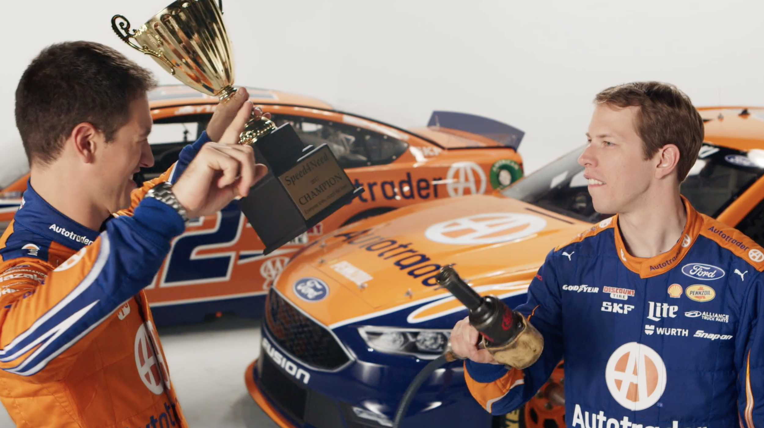 How do you raise money for charity when you’re Autotrader and Nascar? Well, one way is to have professional race drivers Joey Logano and Brad Keselowski face off in the sports equivalent of Mario Party but with champagne, gasoline, and very small plastic hands.
